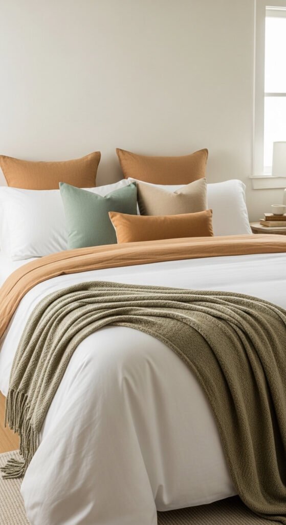 Pick a base (usually white or cream), a secondary (warm gray, sand, or soft blue), and one accent tone used sparingly on throw pillows or a blanket.