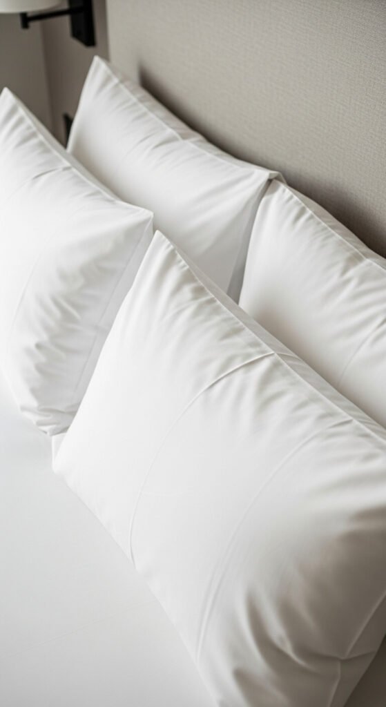 Crisp white pillowcases instantly make a bed feel cleaner and more elevated. If you prefer pattern, keep it subtle — thin stripes or tone-on-tone texture.