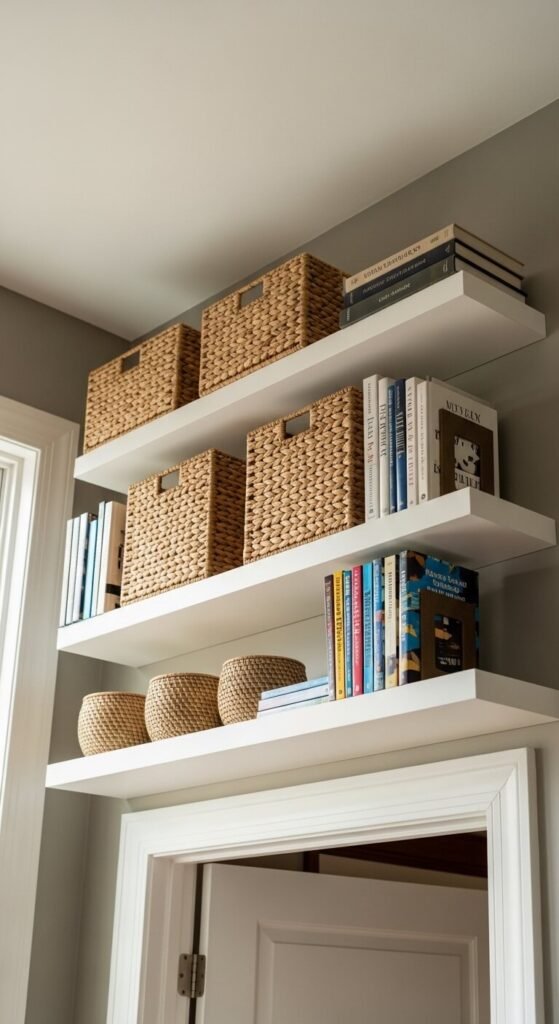 That blank wall above your door is prime real estate going to waste. Install shallow floating shelves 12-18 inches above door frames to store books, decorative boxes, or seasonal items. Use matching baskets to hide clutter while keeping things accessible. Paint shelves the same color as your walls to make them blend in, or choose a contrasting shade to add visual interest. This DIY project costs under $30 and takes about an hour. Just make sure items won’t fall when doors slam.