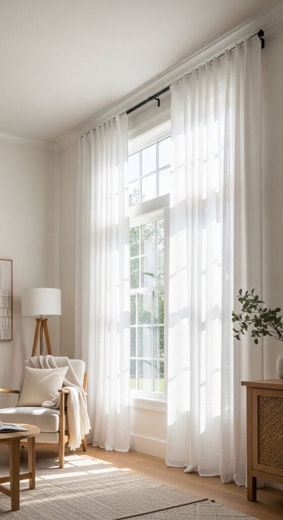 Stop hanging curtain rods right above your window frame. Mount them as close to the ceiling as possible and let panels fall to the floor. This draws the eye upward and makes walls appear taller. Use inexpensive tension rods for a damage-free rental solution, or install permanent hardware for $20-40. Choose light-colored, sheer fabrics to maintain brightness while adding privacy. The vertical lines created by properly hung curtains can make a standard 8-foot ceiling feel several inches taller.