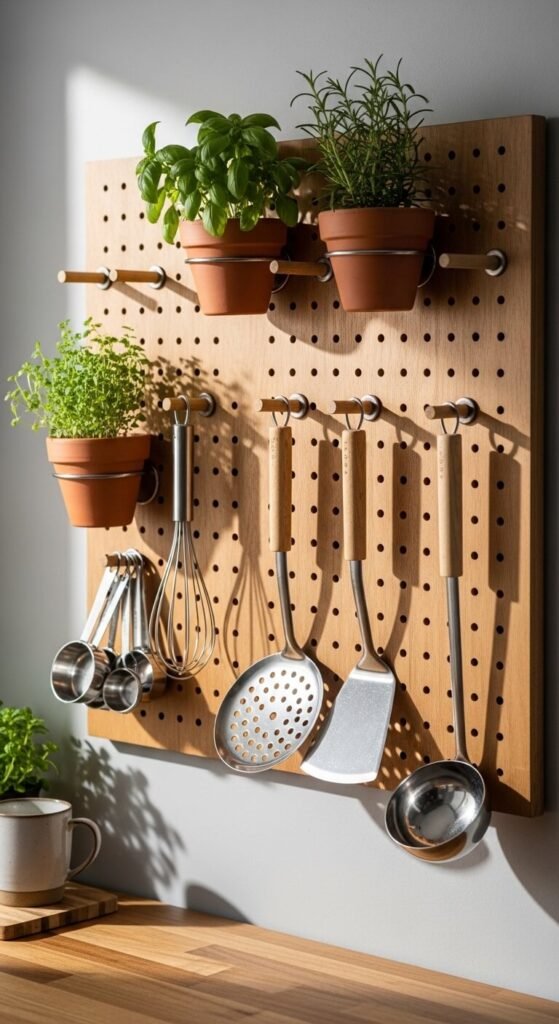 Pegboard isn’t just for garages anymore. Mount a painted pegboard on any empty wall to create customizable storage that adapts as you go. Use it in kitchens for utensils, in bedrooms for jewelry, or in entryways for keys and bags. A 4×8 sheet costs around $15 at hardware stores. Paint it to match your decor, then arrange hooks and shelves however you like. Rearrange pegs anytime without new holes. This system keeps daily items visible and within reach while freeing up drawer and counter space.