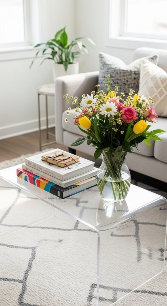 Transparent furniture takes up physical space but not visual space. Glass coffee tables, acrylic chairs, or lucite shelves seem to disappear while remaining functional. The see-through quality keeps rooms feeling open and uncluttered. IKEA and Target offer affordable acrylic options starting around $50. These pieces work especially well in small living rooms where you can see the floor beneath furniture. Just wipe down regularly—fingerprints show easily on clear surfaces.