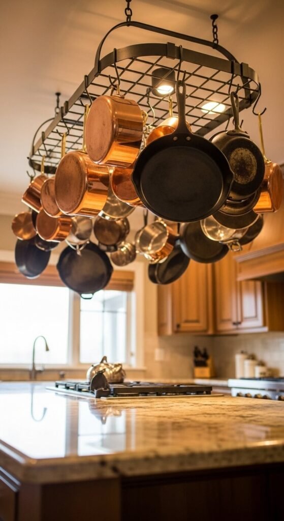 Kitchen cabinets fill up fast. Install a ceiling pot rack to store cookware overhead while adding a professional chef vibe. Basic racks start at $40 at home improvement stores. Make sure your ceiling can support the weight, or use a wall-mounted version instead. This frees up entire cabinets for other items and keeps your most-used pots within easy reach. Polish copper pots become decor. Just clean regularly—grease buildup happens when you cook frequently.