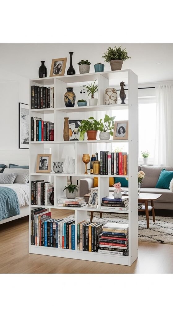 Open floor plans feel spacious but lack privacy. Use a bookshelf as a room divider to separate sleeping and living areas while adding double-sided storage. Place it perpendicular to a wall rather than against it. Fill shelves with books, plants, and baskets. This creates definition without blocking light like a solid wall would. IKEA’s Kallax series works perfectly and costs $60-150 depending on size. Leave some cubes open to maintain sight lines and airflow.