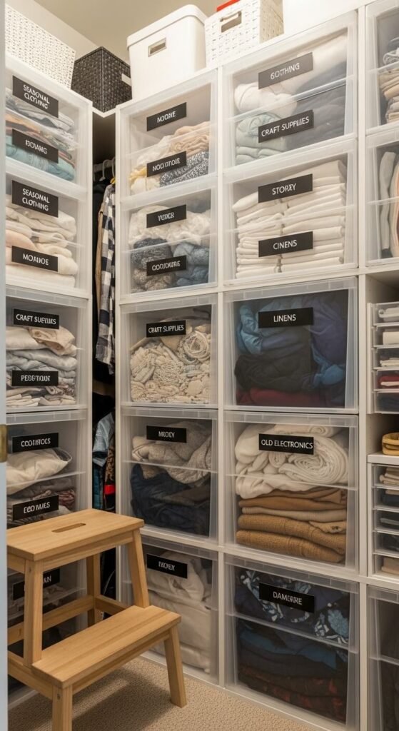 Stackable containers maximize vertical storage in closets, pantries, and under sinks. Choose clear versions so you can see contents without digging. Label each bin for quick access. The Container Store and Amazon offer sets starting at $20. Measure your space first to buy containers that fit perfectly without wasted gaps. Stack seasonal items higher and everyday essentials at eye level. This system keeps similar items together and makes it easy to find what you’re looking for.