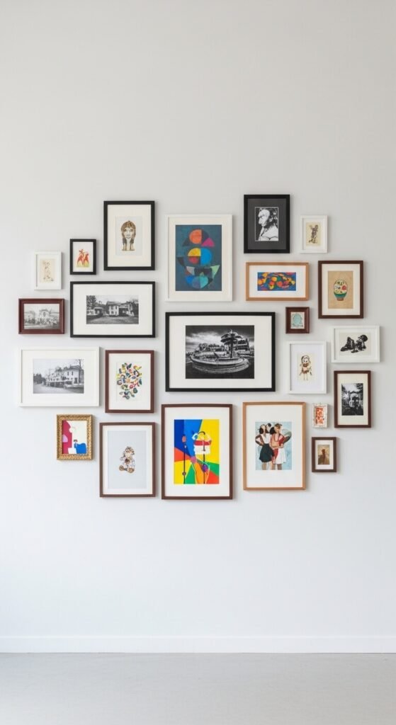 Empty walls feel cold, but cluttered surfaces make rooms cramped. Split the difference with a gallery wall that adds personality and visual depth without taking up square footage. Mix frame sizes and styles you already own or find at thrift stores. Arrange them on the floor first, then transfer to the wall. This draws the eye upward and makes ceilings feel higher. The curated collection becomes a focal point that distracts from the room’s small size.