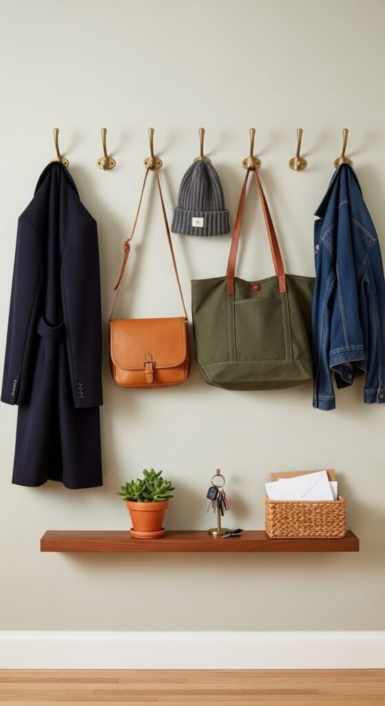 Hooks are the simplest, cheapest storage solution available. Install them in entryways for coats and bags, in bathrooms for towels and robes, in bedrooms for tomorrow’s outfit, and in kitchens for aprons and dish towels. Command hooks work for renters. Permanent hooks cost just a few dollars each. Space them 12-16 inches apart for functionality. Choose decorative hooks that complement your style—brass, black matte, or wooden pegs. Hooks keep items off floors and surfaces while remaining easily accessible.