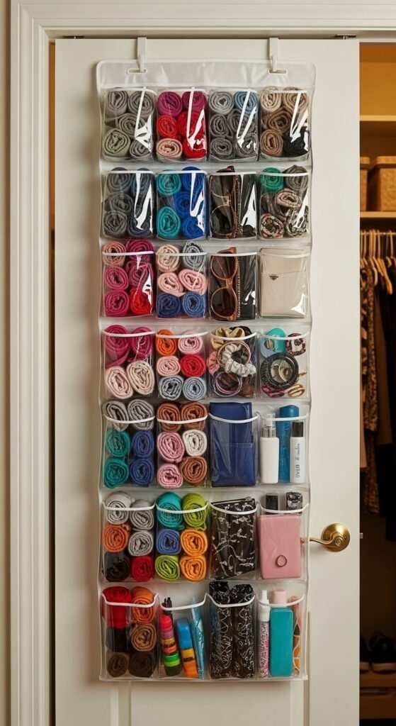 Over-door organizers aren’t just for shoes. Hang them on bedroom doors for accessories, pantry doors for snacks, bathroom doors for toiletries, or closet doors for craft supplies. The clear pocket versions let you see contents at a glance. They cost $10-25 and require zero installation. This captures wasted door space and keeps small items organized. The pockets work for anything that fits—makeup, tools, charging cables, or kids’ toys. Just make sure the door can still close fully with the organizer in place.