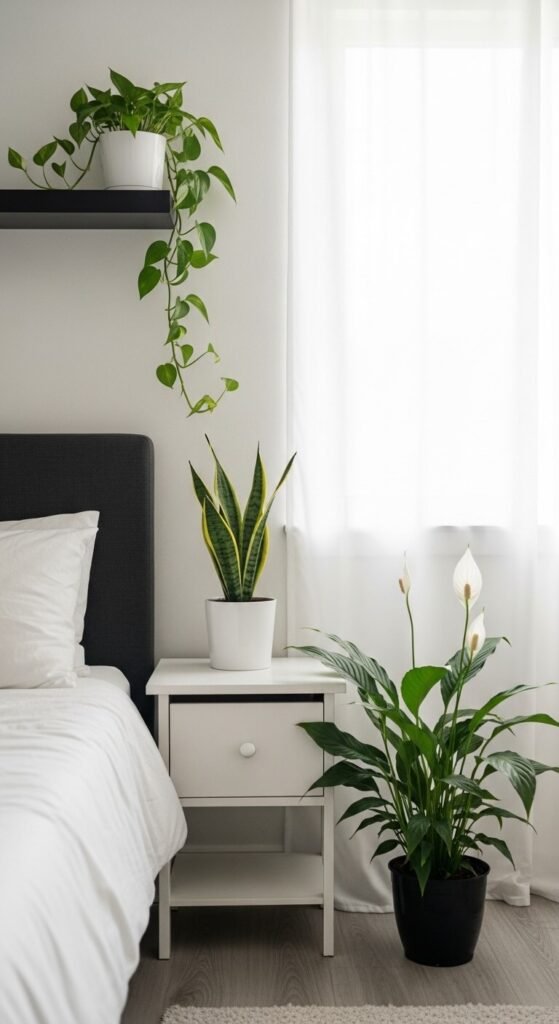 Three specific plants work especially well in bedrooms. Snake plants, pothos, and peace lilies all filter air while adding softness to a sleep space. The snake plant even releases oxygen at night — helpful when you’re sleeping. Keep them at different heights: one on the nightstand, one on a shelf, one on the floor. This layered approach adds depth without clutter. Choose pots that match your bedroom palette for a cohesive, calm look.