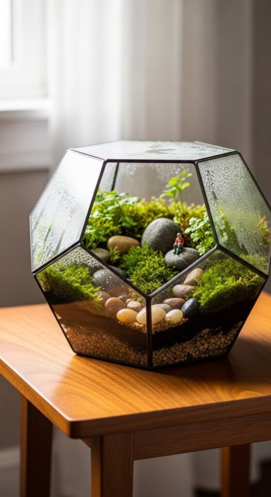 Terrariums are self-sustaining mini gardens that almost water themselves. A closed terrarium holds moisture and creates its own tiny water cycle. Use a large glass jar, a fish tank, or a geometric glass container. Layer gravel, activated charcoal, soil, then plants. Moss, small ferns, and fittonias thrive inside. Sealed terrariums need almost no maintenance. Open terrariums work for succulents and air plants. This is a genuinely impressive DIY project that costs under $20 with thrift store materials.
