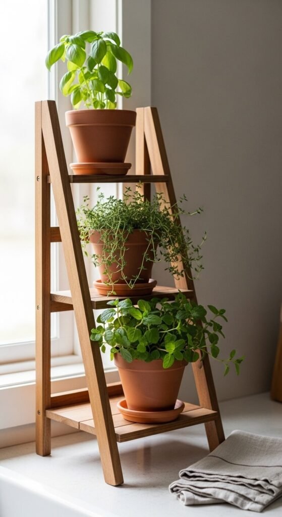 A small ladder shelf on your kitchen counter is a smart vertical solution for herb lovers with limited counter space. Three-tier wooden ladder shelves are widely available for under $25. Stack pots of your most-used herbs. The tiered format gives each plant access to light while keeping your counter organized. It also doubles as a styling moment — add a small candle or a cookbook beside it. Functional and beautiful in one footprint.