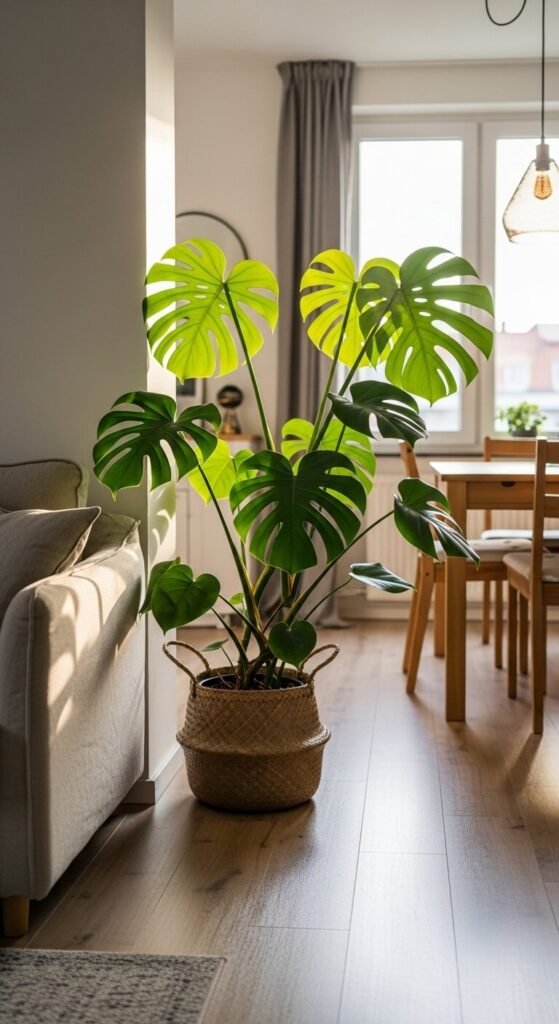 In open-plan spaces, a large monstera can naturally separate areas without walls or shelving. Place a big monstera in a rattan basket between your living and dining zones. The dramatic split leaves create visual separation while keeping the space open and airy. Monsteras grow fast when given bright indirect light and weekly watering. A large one costs more upfront — around $40 to $80 — but it’s cheaper than furniture and doubles as air-purifying décor.
