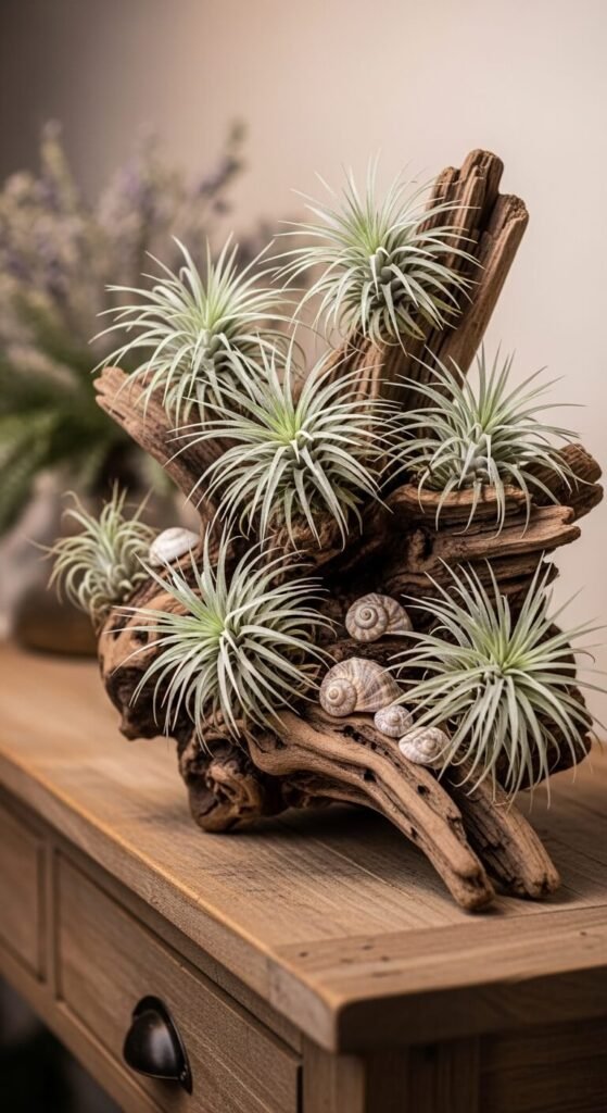 Air plants need no soil at all. They absorb nutrients from the air and a light misting. This makes them incredibly flexible for creative displays. Arrange them on a piece of driftwood from a beach or craft store. Secure with a dab of non-toxic glue. Display on a shelf, mantle, or console table. Mist them twice a week. Soak them in water for 20 minutes monthly. They stay small, live for years, and create an organic, sculptural display that looks expensive but costs almost nothing.