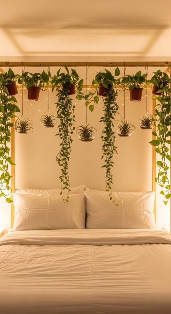 Take your bedroom from ordinary to genuinely enchanting with a simple plant canopy. A basic wooden bed canopy frame costs around $30. Hang small air plant globes and trailing pothos from the top beam. Weave battery-powered fairy lights through the greenery. The result is a romantic, garden-like space above your bed. Use lightweight plants only and check your mounting hardware is secure. This is one of those bedroom upgrades that feels dramatic but comes together in a single afternoon.