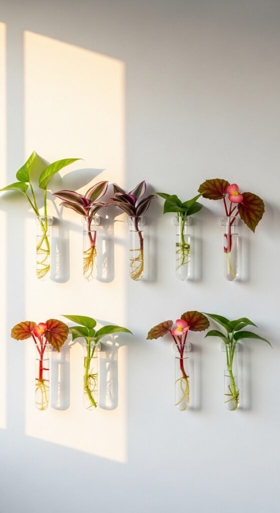 A propagation wall is both functional and beautiful. Mount a row of small glass test tube vases or bud vases on a wall. Fill with water and place plant cuttings inside. Watch them grow roots over days and weeks. It’s a living, ever-changing display. Pothos, tradescantia, begonia, and spider plant all root easily in water. Wall-mounted glass vases are under $15 for a set online. Label each cutting with a small tag. It makes plant care feel like an art installation.