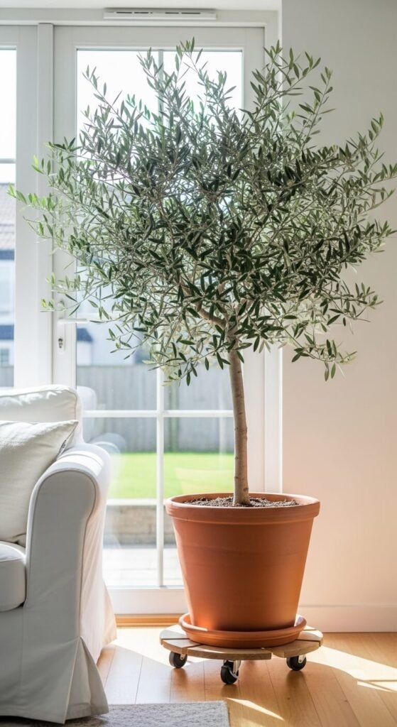 Some of the most beautiful indoor plants are technically outdoor trees scaled down. Olive trees, lemon trees, and bay laurels all grow well indoors near a very bright window or glass door. They add height, texture, and a Mediterranean feel to living rooms. A potted olive tree on a rolling wooden plant caddy near your sunniest window can become the defining feature of your whole room. Water regularly and give them as much light as possible.