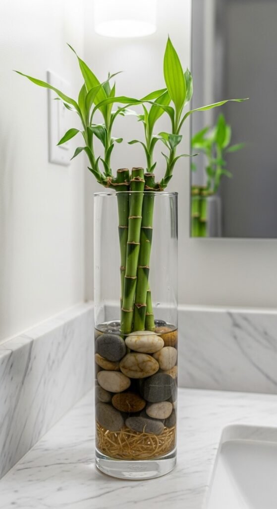 Lucky bamboo grows in nothing but water and pebbles. No soil, no mess. Place a few stalks in a tall glass vase, fill with river stones from a craft store, and add water. Change the water every two weeks. It tolerates low bathroom light and actually prefers indirect light. The result is a clean, sculptural bathroom accent that looks like something from a high-end hotel. A bundle of lucky bamboo costs about $6 at most garden centers or Asian grocery stores.