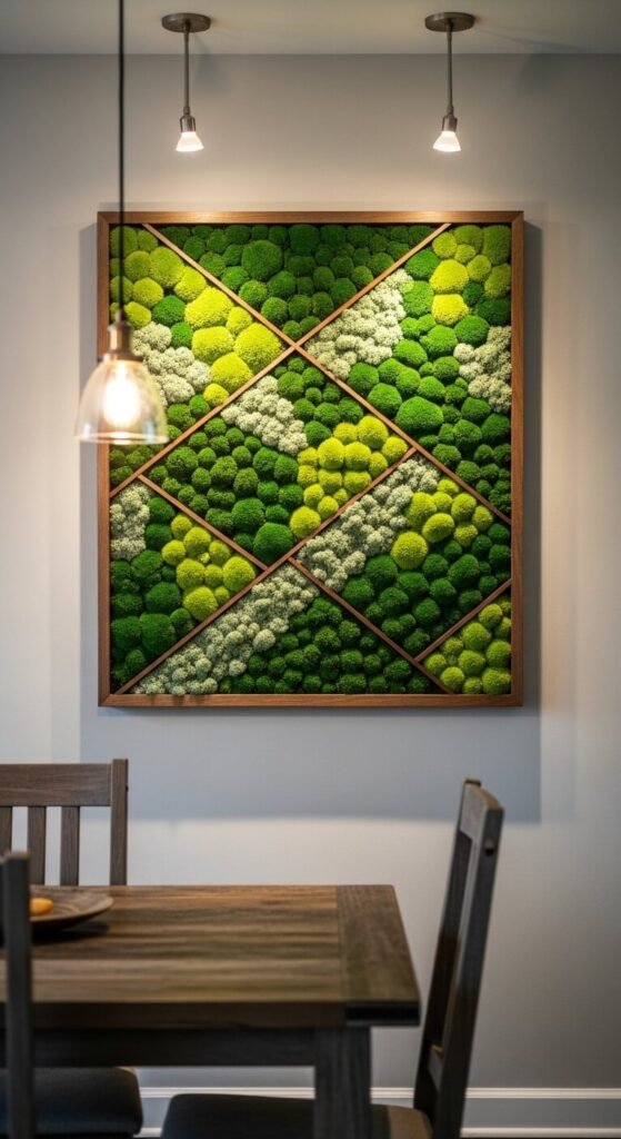 Preserved moss walls require zero watering or maintenance. The moss is treated to stay green and lush without being alive. Frame it in a shadow box and hang it like a painting. DIY kits are available online for around $30 to $50 and include everything you need. You can also buy preserved sheet moss and cut it yourself. This gives you a permanent, lush green wall accent with no upkeep. Ideal for rooms with no natural light where real plants simply won’t survive.