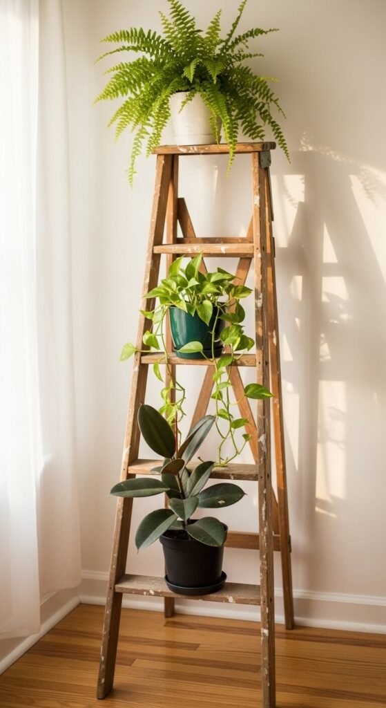 An old wooden ladder is one of the most useful free plant stands you’ll ever find. Lean it against a wall and place potted plants on each rung. The staggered height creates a dynamic, layered arrangement. Check thrift stores, garage sales, or even your own garage. Sand and repaint it if needed. Style it with plants of varying heights — tall on the bottom, trailing on upper rungs so they cascade down. This hack costs nothing and adds tremendous character to any room.
