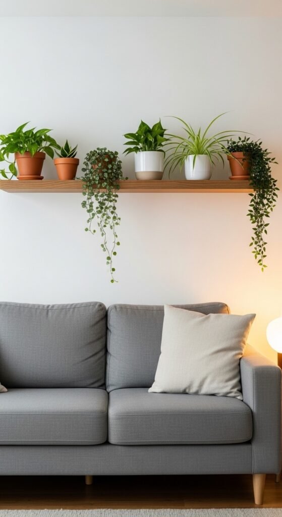 The wall above your sofa is prime display real estate that most people leave blank. A single long floating shelf gives you a perfect plant ledge. Arrange a mix of plants — some upright, some trailing. Keep trailing plants toward the edges so they cascade down around the sofa. This creates a natural, organic frame for your seating area. Use a mix of pot sizes and materials for visual interest. Install the shelf at ceiling height for maximum drama and an illusion of taller ceilings.