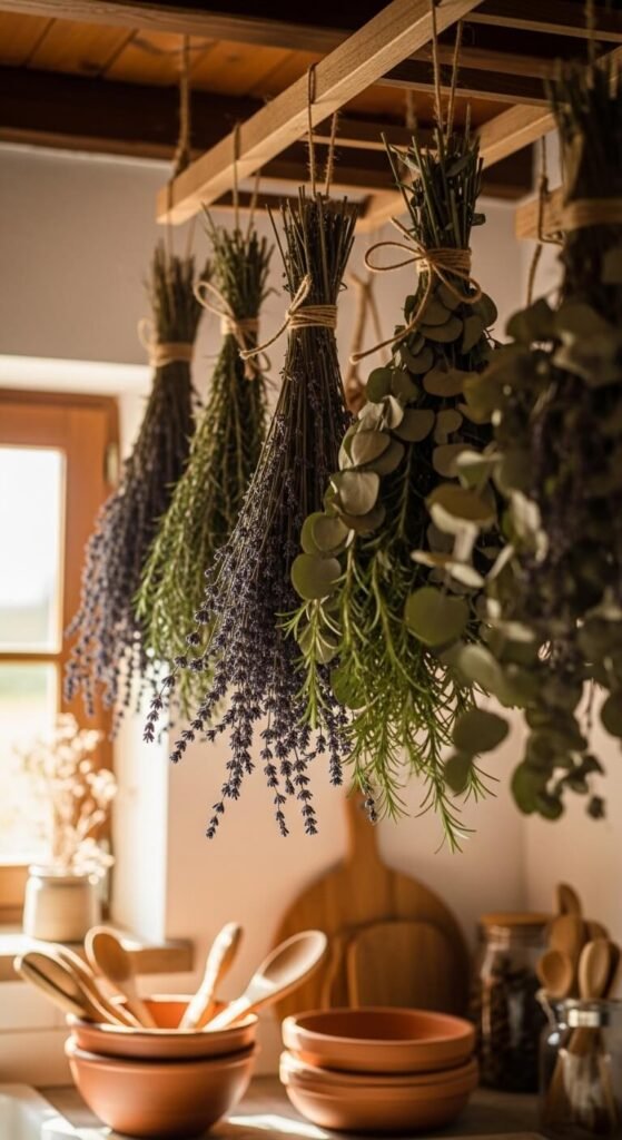Dried herb bundles hung from a kitchen rack are part décor, part pantry. Bundle fresh lavender, rosemary, sage, or eucalyptus with twine. Hang from a ceiling rack, a curtain rod, or adhesive hooks under a cabinet. As they dry, they fill the kitchen with a subtle scent. They look beautiful for months. Clip bits off as you cook. This is one of the cheapest decorating ideas in this entire guide — often free if you grow your own or find fresh bundles at a farmers market.