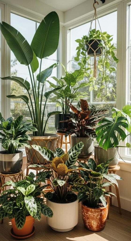 If you have a sunroom, a bright corner, or a south-facing room — go all in on a jungle corner. Group your largest, most dramatic plants together. Layer heights using plant stands, stacked books, and floor pots. A bird of paradise, a large monstera, a few hanging pothos, and a cluster of calatheas together create an immersive, lush environment. The key is grouping — plants together look intentional. Plants scattered around a room just look like clutter. Bring them together and the transformation is immediate.
