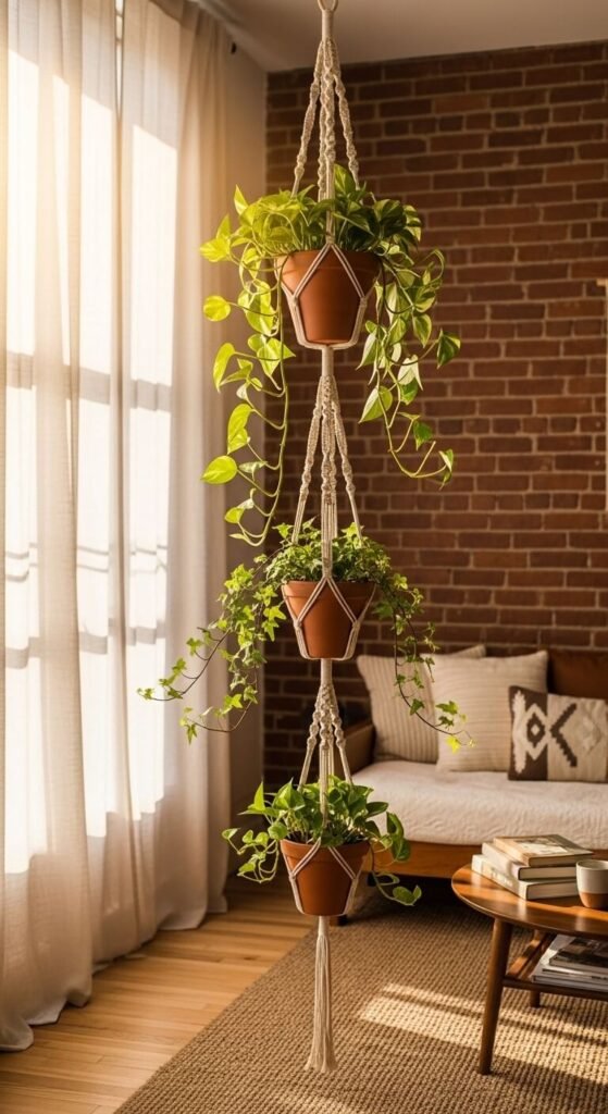 Hanging plants solve the floor space problem. Macramé hangers are cheap or easy to DIY with basic cotton rope from any craft store — tutorials are everywhere online. Hang three at different heights for a layered, sculptural look. A pothos, a small fern, or a string of hearts all work beautifully. Install a basic ceiling hook rated for a few pounds. The whole setup can cost under $15 and adds serious visual height to any room.