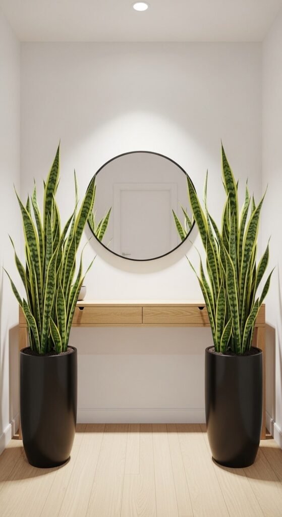 Snake plants are nearly indestructible. They thrive on neglect, tolerate low light, and filter toxins like benzene and formaldehyde from the air. Place a matching pair on either side of your entryway console table for a structured, welcoming look. Use matching pots — matte black or concrete gray look especially sharp. Water them once every two weeks at most. They’re one of the best plants for people who forget to water things, which is most of us.
