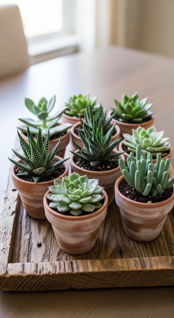 Group small succulents together for a display that’s bigger than the sum of its parts. A thrift store tray or wooden crate works perfectly as a container. Fill it with five to ten different succulent varieties in tiny pots. Mix shapes — rosettes, columns, trailers. Succulents are sold in multipacks at garden centers for a few dollars each. This arrangement works on a coffee table, dining table, or window ledge. Rotate the tray monthly so all sides get light exposure.