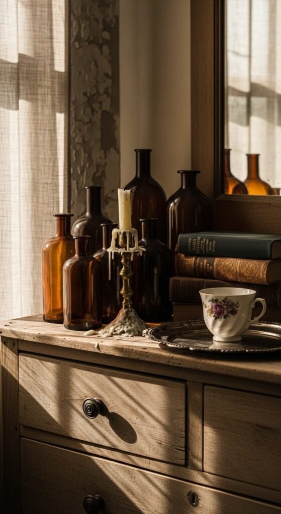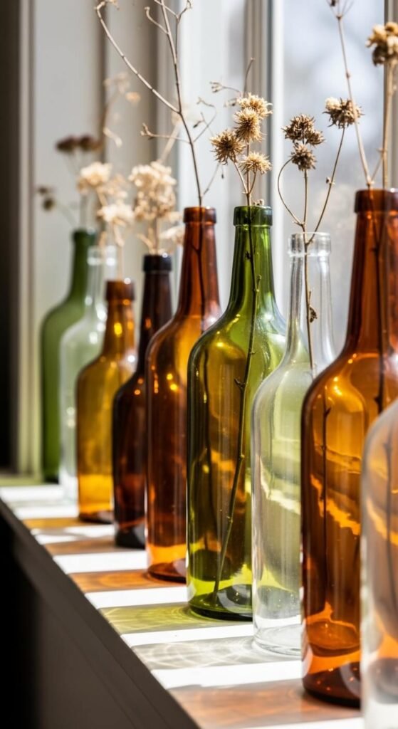 Old apothecary bottles, milk glass, and medicine vials from flea markets cost almost nothing. Line them along a windowsill so light passes through and casts warm color onto the wall or floor. Group them by color for a cleaner look, or mix them freely for a more casual feel. Drop a single dried stem or tiny sprig of eucalyptus into a few. This works especially well in kitchens and bathrooms where shelf space is tight but you still want charm.