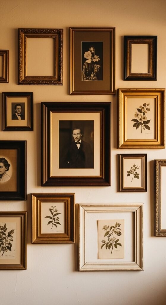 Old frames are everywhere at thrift stores — and usually dirt cheap. Mix metals, woods, and sizes for an intentional collected look. You don’t need matching artwork either. Use family photos printed in black-and-white, torn book illustrations, or even plain linen fabric stretched inside. Lean a few frames instead of hanging them all. Start with a large anchor frame and build outward. This is one of the easiest ways to make a blank wall feel like it has decades of history behind it.