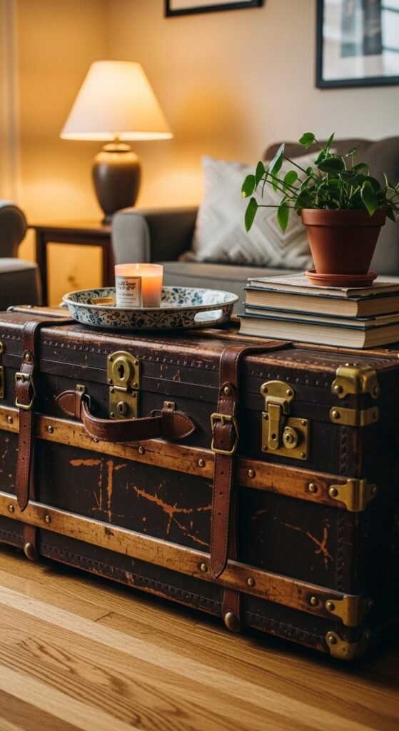 3. Worn Leather Trunk as a Coffee Table