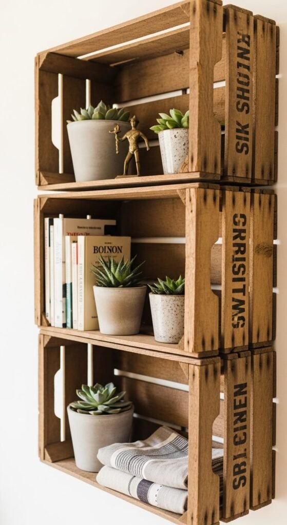 Old wooden crates — apple boxes, wine crates, milk crates — make surprisingly practical shelves. Mount them directly on the wall with basic hardware, or simply stack them on the floor. Fill with books, plants, candles, or baskets. The natural wood grain and any old stenciling on the side adds instant vintage texture. You can find them at farm supply stores, antique shops, or salvage yards. Sand lightly if needed, but don’t refinish — the weathered look is the whole point.