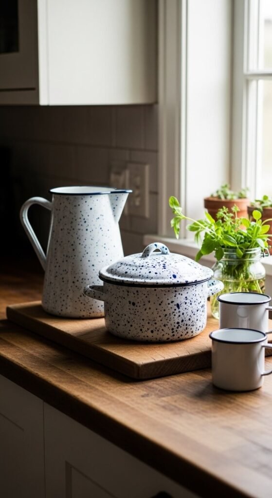 Enamelware has that distinctly old-fashioned charm that fits perfectly in farmhouse or cottage kitchens. Look for classic white with blue or red speckle patterns at flea markets and thrift stores. Use the pieces functionally — store utensils in a pitcher, use a pot as a fruit bowl, or display mugs on open shelving. Chips in the enamel are normal and expected. They add to the character. A full set usually costs under $20 at a good thrift store.