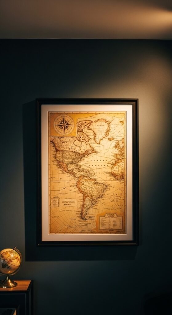 Vintage maps are beautiful, affordable, and conversation-starting. You can find genuine old maps at estate sales for just a few dollars. Or print high-resolution reproductions of historical maps for free from library archives online. Frame them simply — the map itself is detailed enough. Great for a home office, library corner, or hallway. Choose a map that means something to you: a hometown, a place you’ve traveled, or a historical region you love.