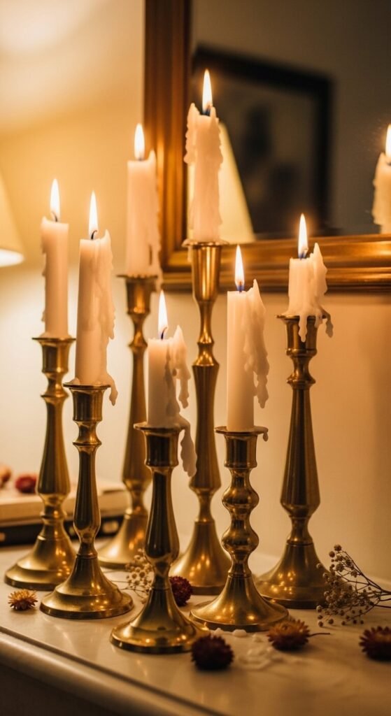 Brass is having a major moment, and vintage brass is better than the new stuff. The patina on old brass — slightly dark, a little uneven — has a warmth that polished modern brass can’t replicate. Candlestick holders are easy to find at thrift stores, usually for $1–$5 each. Collect them in different heights and group them together on a mantel, shelf, or dining table. You don’t even need to light the candles. They look great just sitting there.