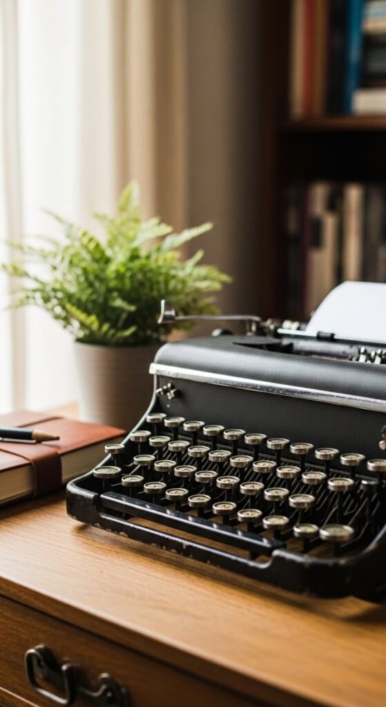 A vintage typewriter on a desk does something magical to the atmosphere of a room. It signals creativity, craft, and slowness in the best way. You don’t need it to work — though many old models do. Find them at antique stores, estate sales, or online. Prices vary from $20 to $150 depending on condition and brand. Set it on a desk with a journal and a small plant beside it. It becomes an instant focal point that people always comment on.