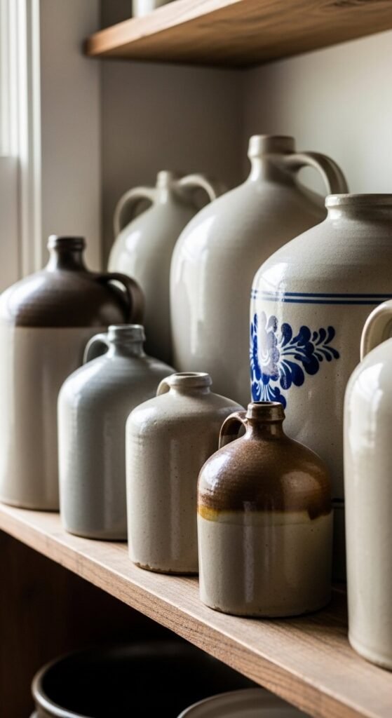 Old pottery crocks have a heaviness and simplicity that modern ceramics rarely achieve. Use them in the kitchen as utensil holders, bread storage, or purely as display pieces. Antique stoneware with hand-painted cobalt designs is especially striking. Thrift stores and antique malls often stock these for $5–$25. They work beautifully on open shelving, kitchen counters, or farmhouse sideboards. A single large crock can anchor an entire shelf arrangement on its own.