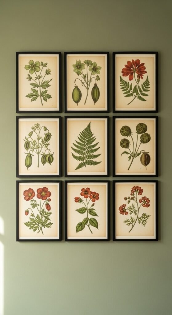Antique botanical illustrations have a timeless quality. Find originals in old encyclopedias or science books at used bookstores — you can carefully remove pages and frame them affordably. Or download free public domain botanical prints from sites like Biodiversity Heritage Library. Print at home and frame with simple black or wooden frames. Hang in a uniform grid for a clean gallery look. Works in living rooms, bathrooms, hallways, and home offices without feeling out of place.