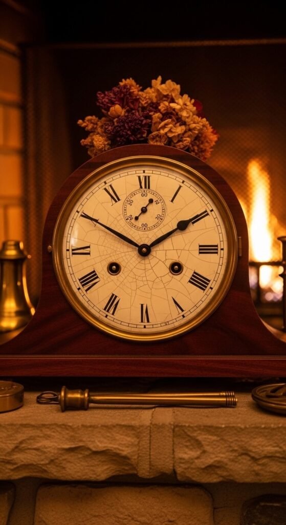 An old clock — even one that no longer works — adds incredible presence to a mantel or shelf. The face itself is the art. Cracked enamel, Roman numerals, brass hands, aged wood cases — these details have far more character than anything modern. Look for wall clocks, mantel clocks, or small travel alarm clocks at antique stores. Pair a stopped clock with fresh or dried flowers for an unexpectedly romantic display. Nobody needs to know it doesn’t tick.