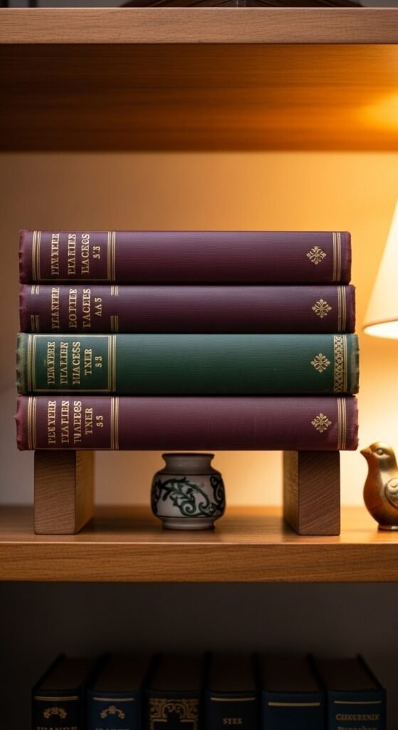 Old books are everywhere and usually free or nearly free. Stack them horizontally as risers under plants, candles, or small sculptures. Line them on a shelf by color — all dark green spines together, or a mix of burgundy and gold — for a curated look. The aged fabric covers, worn gilding, and foxed pages all add visual texture. Used bookstores, library sales, and thrift stores are your best sources. Don’t worry about the titles. Treat them as objects.