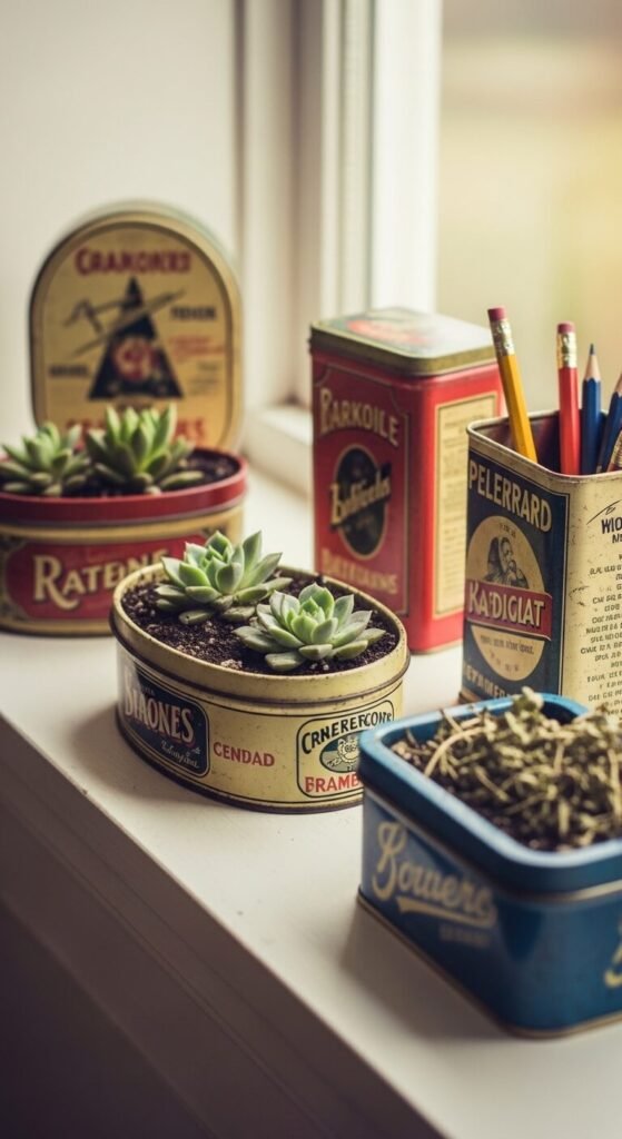 Old biscuit tins, tobacco tins, and tea canisters have the most beautiful faded graphics. Plant small succulents or herbs directly inside them by punching a few drainage holes in the bottom. Or use them on a desk to hold pens, scissors, or loose change. Line a few on a windowsill for a charming, mismatched collection. Thrift stores and antique shops often have these for $1–$5 each. The worn litho printing on old tins is genuinely irreplaceable — it was made by hand.