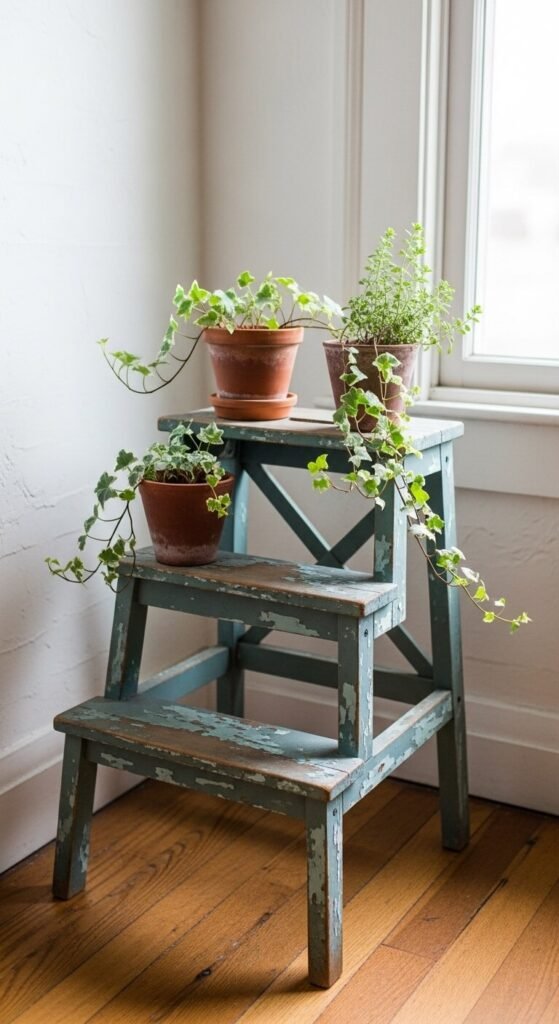 A vintage step stool is one of those finds that works in literally every room. Use it as a plant stand, a side table, a display riser, or extra seating. The worn paint and scuffed wood only make it better. Look for these at farm auctions, estate sales, and thrift stores. Paint is optional — the original patina usually looks better. A three-step stool in a corner of a kitchen or bathroom instantly adds both function and vintage charm at the same time.
