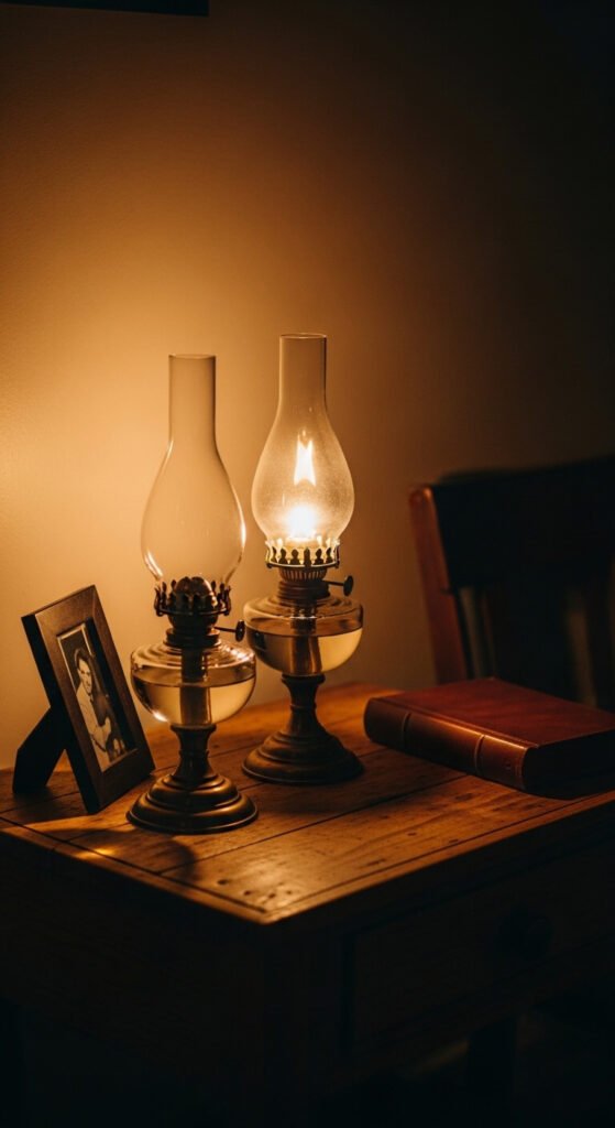 Old hurricane lamps and oil lamps bring a warmth that electric lighting simply can’t replicate. Even unlit, they look beautiful on a shelf or side table. Fill the base with colored sand or tiny stones if you don’t want to use actual oil. Lit with a real flame, they create an atmosphere that transforms a room entirely. Find them at antique stores and estate sales. Brass bases, clear glass chimneys, and aged patina are what to look for.