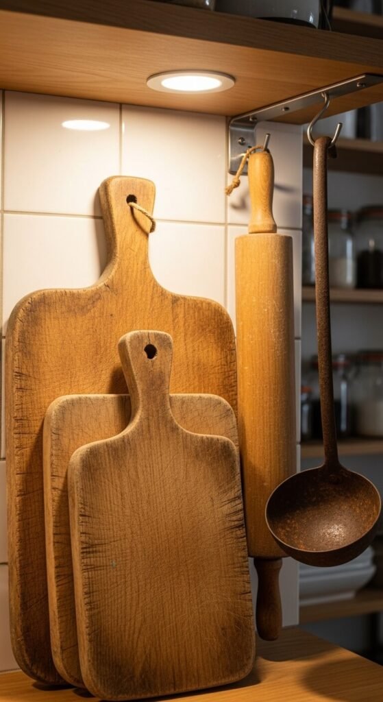Old kitchen tools have a handmade quality that modern ones mass-produced in factories can’t match. Lean a few wooden cutting boards against your backsplash as a display. Hang old iron ladles or wooden-handled utensils from simple hooks. Look for these at farm sales and antique markets. The worn grain of an old breadboard, the patina on an iron ladle — these textures tell you the object was actually used. Display them proudly in the kitchen where they belong.