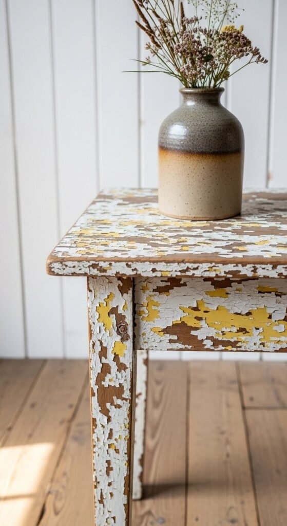 Furniture with naturally chipped, peeling paint is extremely sought-after in vintage decor right now — and for good reason. The layers of old paint tell a story of age and use. Don’t be put off by pieces that look “rough.” A chippy-paint side table or chair in white, blue, or green is a character piece that anchors a room. Find these at estate auctions and thrift stores. Resist the urge to repaint. The imperfection is precisely the point.