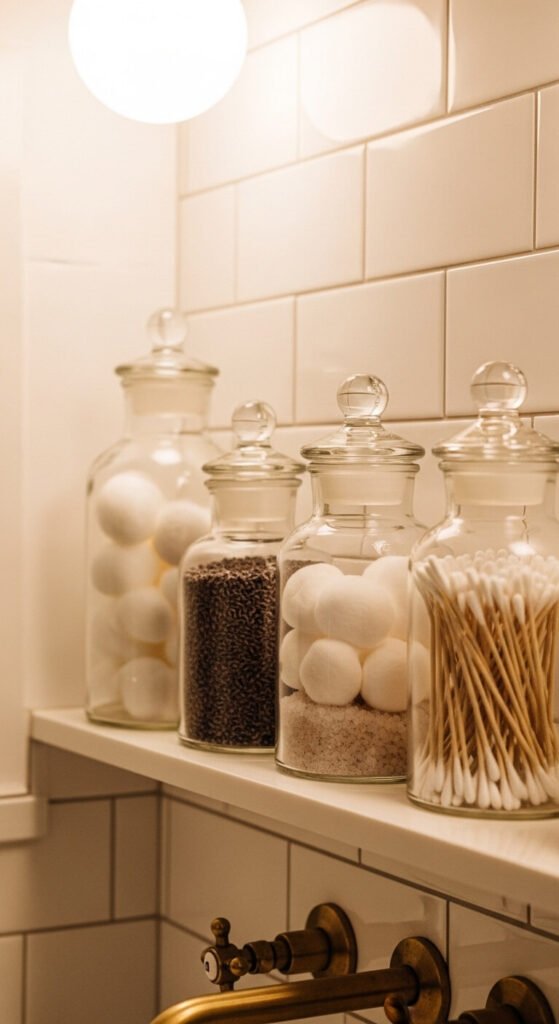 Old apothecary jars with glass stoppers look elegant anywhere — bathrooms, kitchens, home offices. Fill them with cotton balls, bath salts, dried herbs, or small stones. The heavy glass and ground-glass stoppers of vintage apothecary pieces have a quality that modern versions rarely replicate. Find them at antique stores, pharmacies going out of business, or online vintage shops. A row of three or four in different heights on a bathroom shelf immediately elevates the entire space with almost no effort or cost.