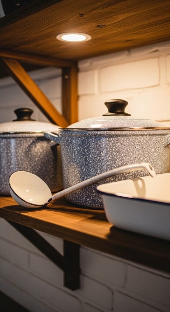 Old graniteware — that distinctive speckled enamel over iron — is one of the most recognizable vintage kitchen materials. Blue and white speckle is the classic, but you’ll also find red, green, and grey versions. Use them functionally or display them on open shelving as visual texture. The speckled surface and black rim detailing are timeless. Look at farm sales, antique malls, and thrift stores. These pieces are durable enough to still cook with — or beautiful enough to just look at.