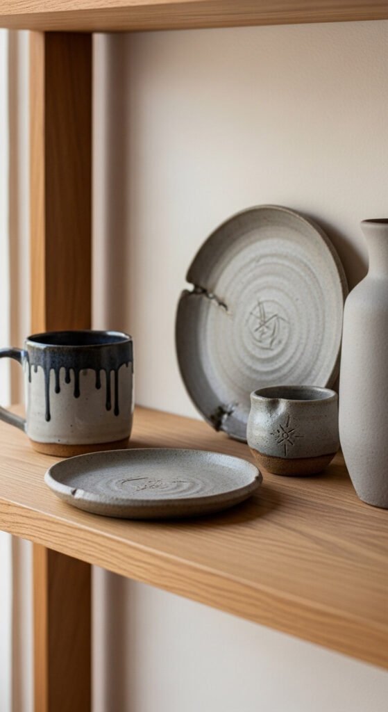 Old handmade pottery has a character that factory pieces never achieve. Look for pieces with visible hand-building marks — uneven rims, thumb impressions, dripped glaze. Estate sales sometimes yield beautiful studio ceramics from local artists who were active decades ago. Mix them freely on a shelf — a matte black mug beside a honey-glazed bowl, a rough-textured vase next to a smooth stoneware plate. The variety creates exactly the kind of rich, layered display that makes a space feel personal and real.