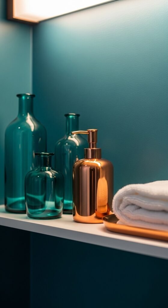 Teal and copper is one of those unexpected pairings that instantly looks curated. The cool depth of teal and the warm glow of copper balance each other out perfectly. This palette works in bathrooms, kitchens, and living rooms. Copper accessories — think soap dispensers, drawer pulls, or candle holders — are widely available and affordable. Pair them against a teal wall or teal-painted furniture for a put-together look that costs very little.